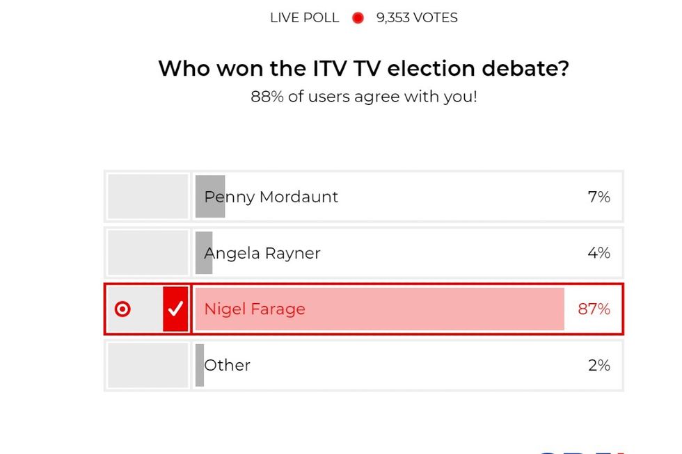 In the exclusive poll for GB News membership readers, an overwhelming majority (87 per cent) of the 9,353 voters thought Nigel Farage won the debate, seven per cent thought Penny Mordaunt won and just four per cent thought Angela Rayner won. Two per cent said they thought another candidate won.