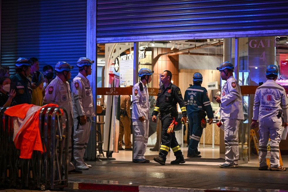Unverified videos shared on social media showed people, including children, running out of the doors of the Siam Paragon mall while security guards ushered them out.