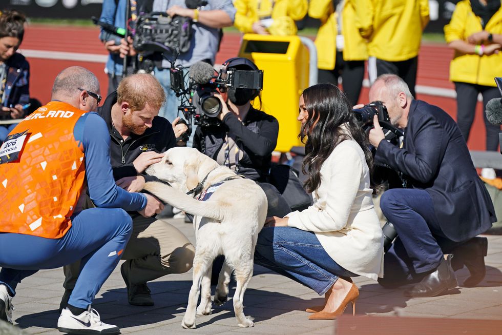 The Duke and Duchess of Sussex meet a competitor from the Netherlands and his dog at the Invictus Games athletics events in the Athletics Park, at Zuiderpark the Hague, Netherlands on April 17, 2022.