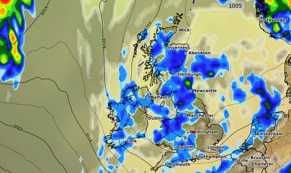 "The UK rainfall over the next few days will mostly be from showery outbreaks from the west (particularly in the northwest) until the new little low moves through on Wednesday/Thursday with frontal rain."