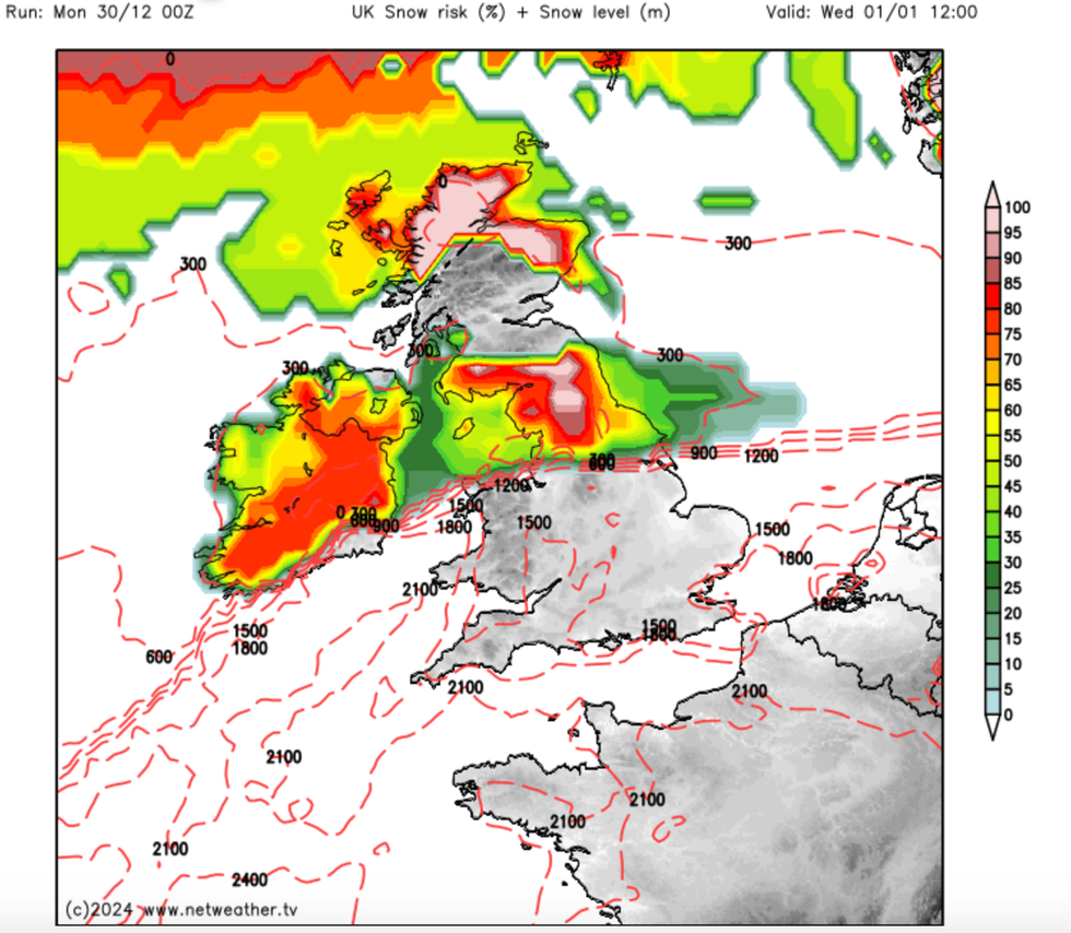 Foul weather will hit northern Britain first before moving south through New Year’s Day and the start of 2025