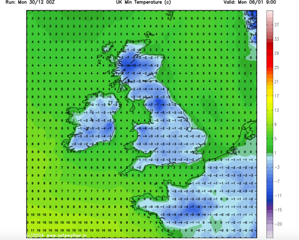 As winds spill in from the Arctic, thermometers will plunge widely with the most exposed parts nudging minus 17C.