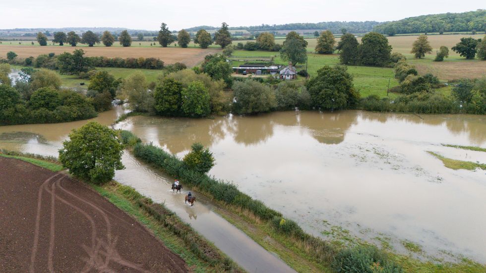Horse riders make their way through flood water in Walton in Warwickshire