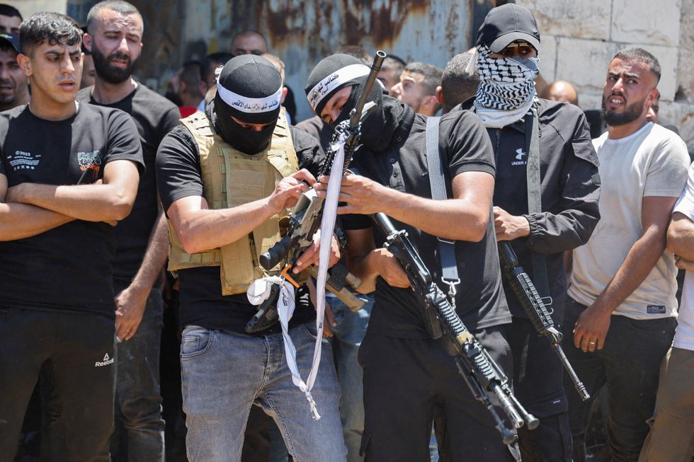 Gunmen attend the funeral of Palestinians killed during an Israeli operation in Jenin