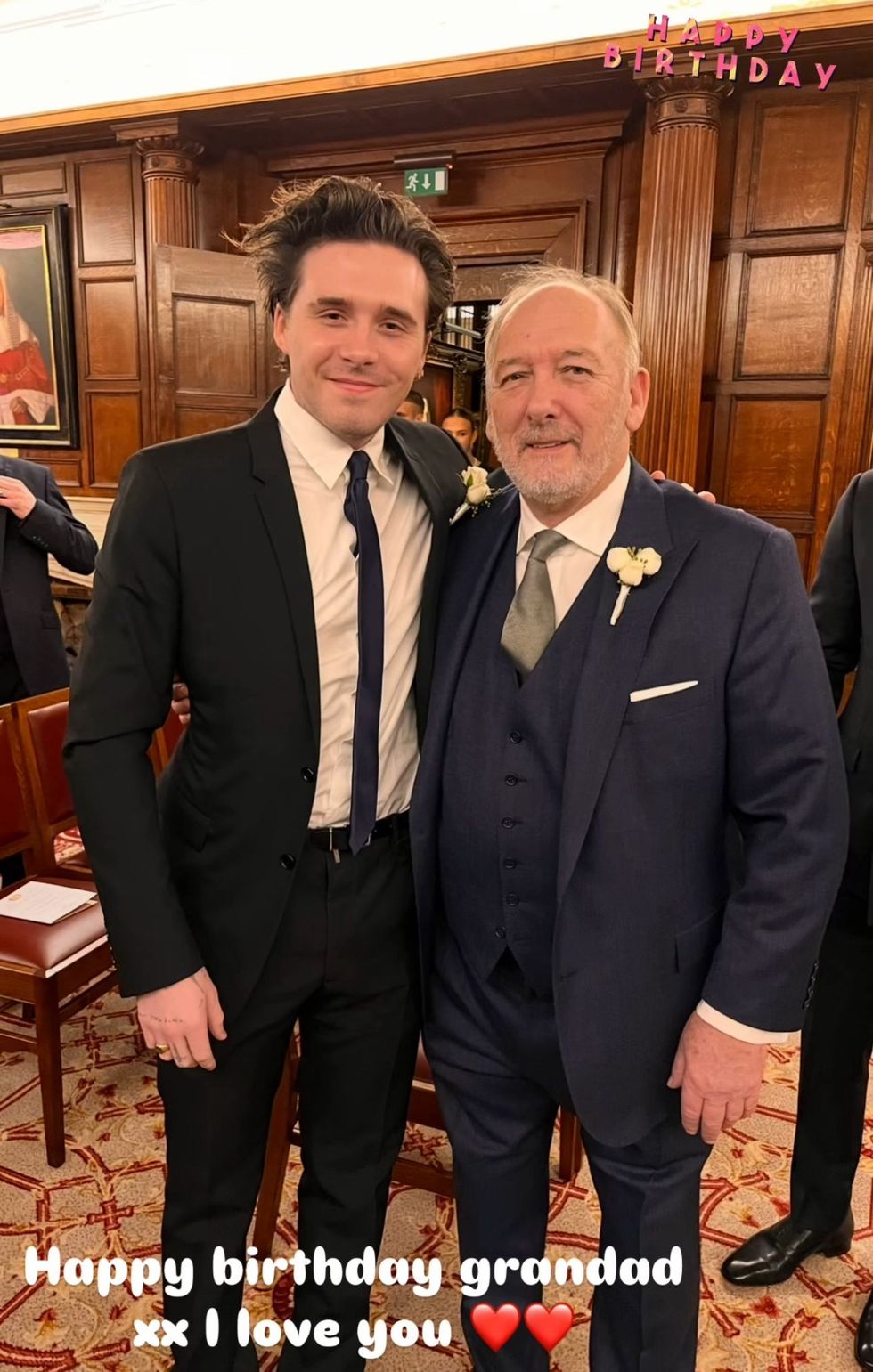 The oldest Beckham sibling posted a tender photograph of himself and his grandfather, Ted Beckham, dressed up to the nines in a suit and tie, smiling with their arms around each other.