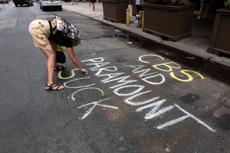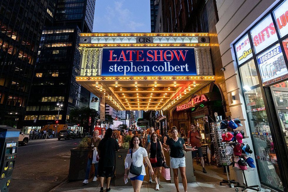 Protests erupted outside the Ed Sullivan Theatre in New York City last week , where the show is taped. Demonstrators carried signs saying “CBS Sucks" and "Colbert Stays! Trump Must Go!”.