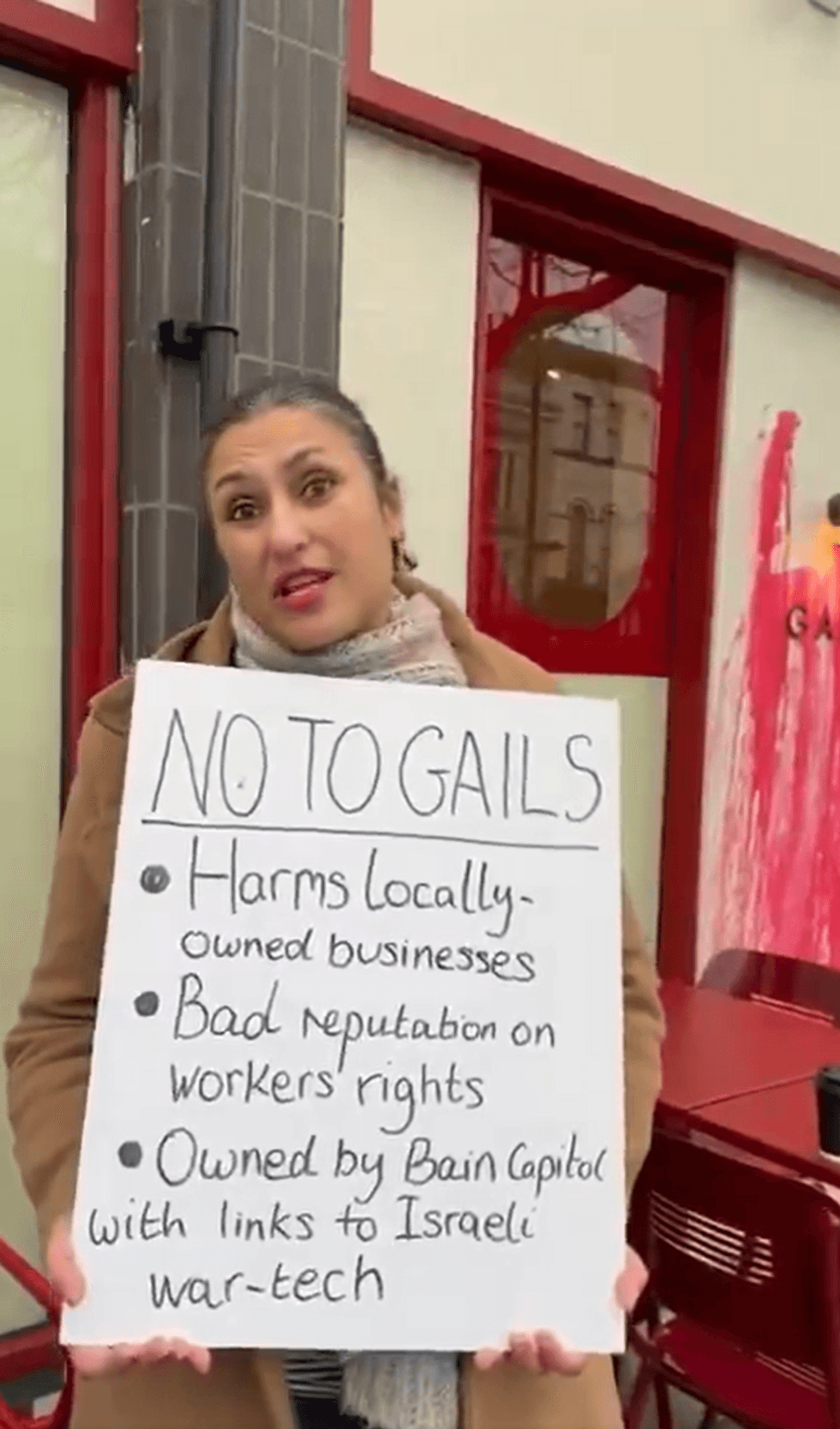 Signs visible in the footage included unverified claims reading: “Boycott Israel for genocide and war crimes in Gaza” and “NO TO GAIL'S – Harms locally owned businesses, bad reputation on workers’ rights, has links to Israel.”