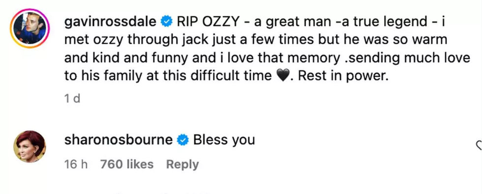 "We send our love to his family. OK Ozzy, we love you, wherever you're going. Thank you for everything."
