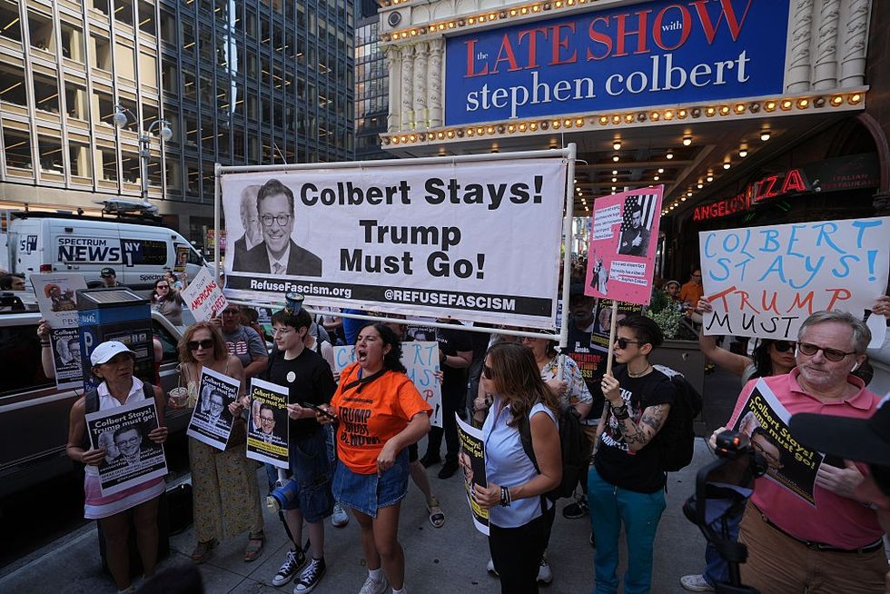 Anti-Trump protesters rally outside CBS Late Show Studio over Colbert Firing | Getty"I mean, obviously, CBS saw my upper lip and boom, cancelled. Coincidence? Oh, I think not. This is worse than fascism. This is stachism," he said in response to the settlement.