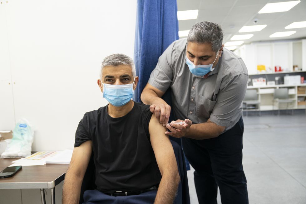 Mayor of London Sadiq Khan receives his Covid-19 booster jab after having his flu vaccination, during a visit to the health clinic at Pearl Chemist in London on October 11, 2022.