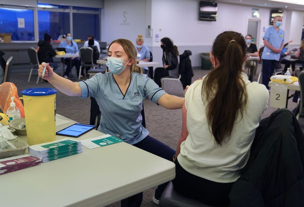 People are given a vaccination at a COVID-19 booster vaccination centre at Hampden Park vaccination centre in Glasgow on December 29, 2021.