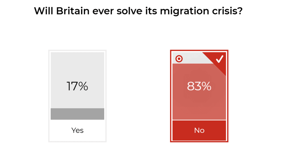 After nearly 1,300 votes, 83 per cent of GBN members thought that Britain would ever be able to solve its migration crisis, while just 17 per cent thought it would.