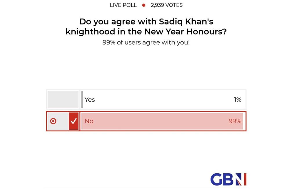 A whopping 99 per cent of GB News members who voted in the poll do not agree with Khan's knighthood, while just one per cent agree.