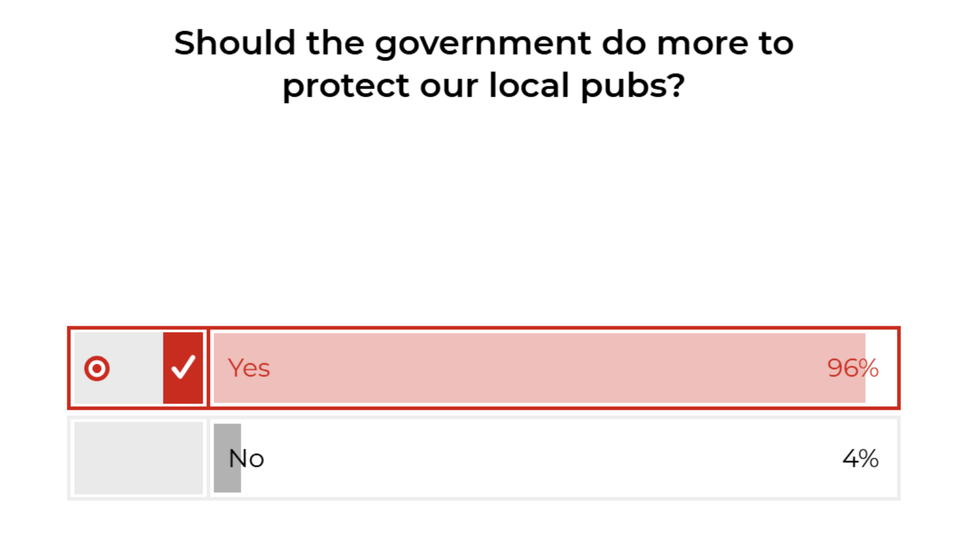In an exclusive poll for GB News membership readers, an overwhelming majority (96 per cent) of voters thought the Government should do more to protect our local pubs, while just four per cent thought it should not.