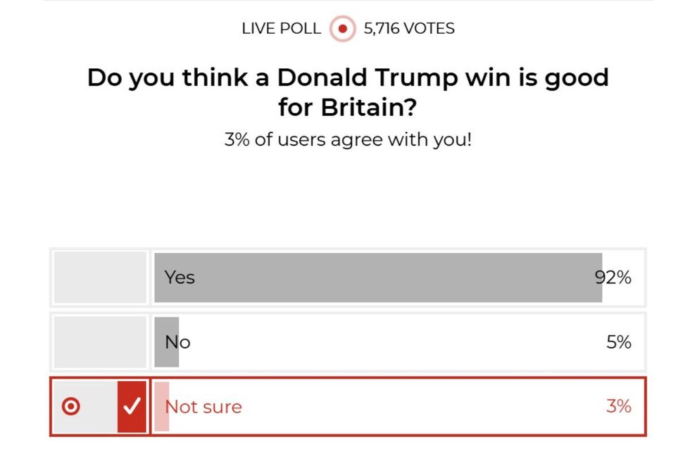 A staggering 92 per cent of the 5,716 respondees argued Trump is good for Britain, with just five per cent voting no and two per cent unsure.