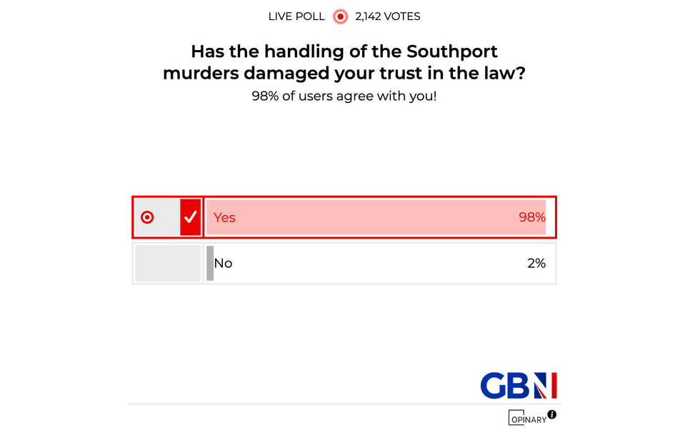 A huge 98 per cent of GB News members who voted in the poll agreed that the handling of the Southport murders has damaged their trust in the law, while just two per cent disagreed.