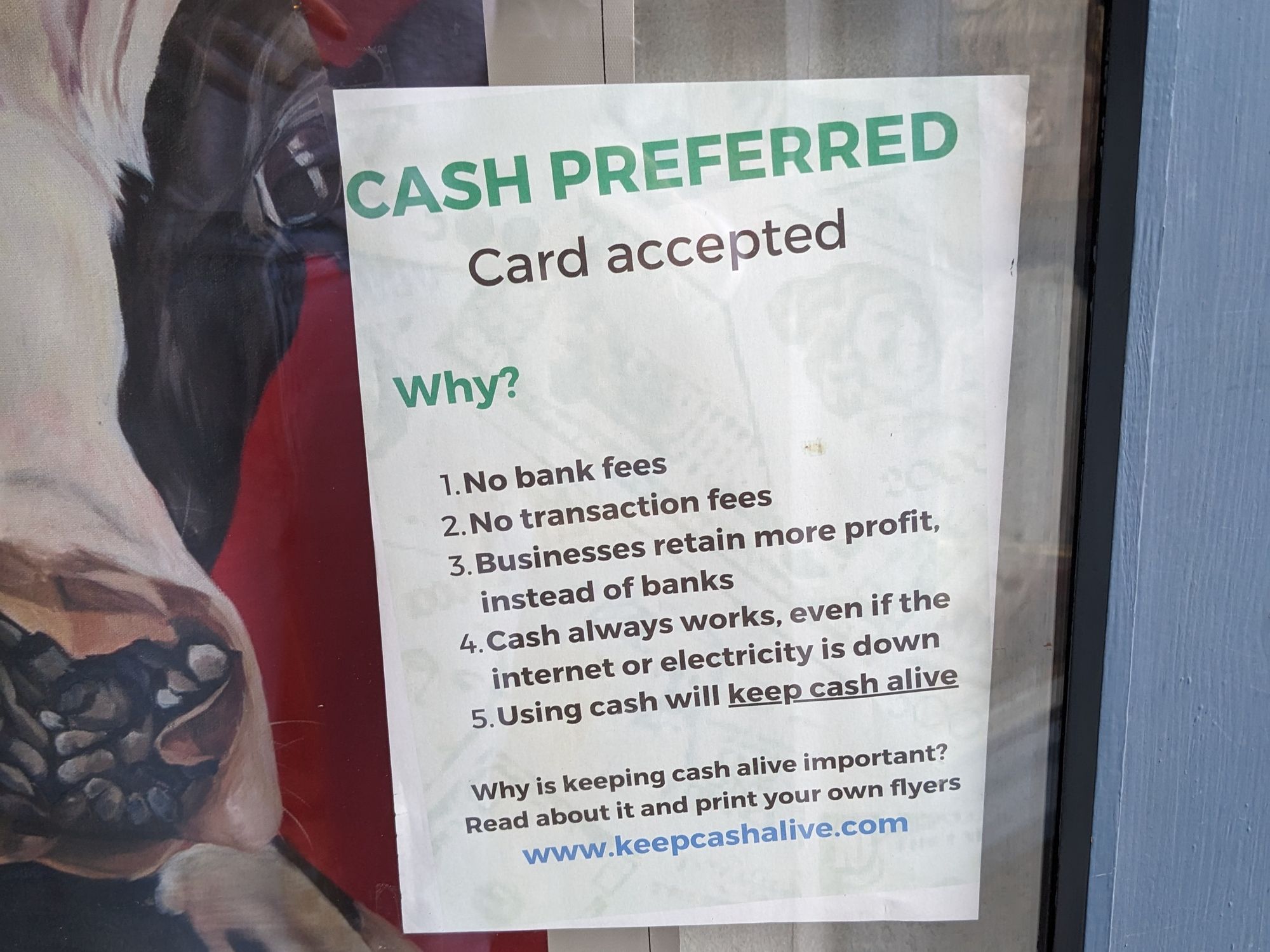 Thuline Hill, who paints and sells from the Thuline studio-gallery in Windermere, has decided to encourage the use of cash by placing a “card accepted, cash preferred” sign in the window.