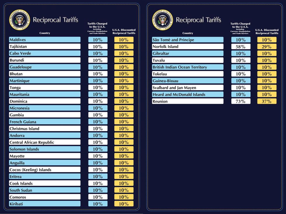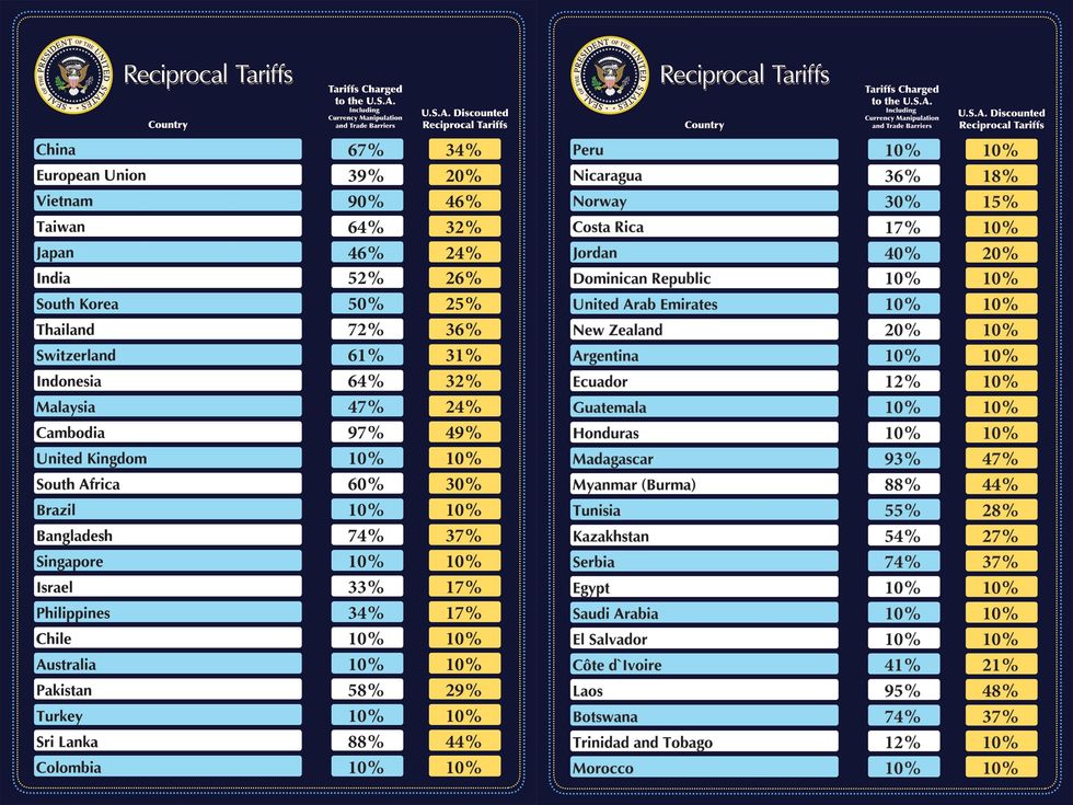 The full list of countries facing new tariffs includes China at 34 per cent, South Korea at 25 per cent, and India at 26 per cent.