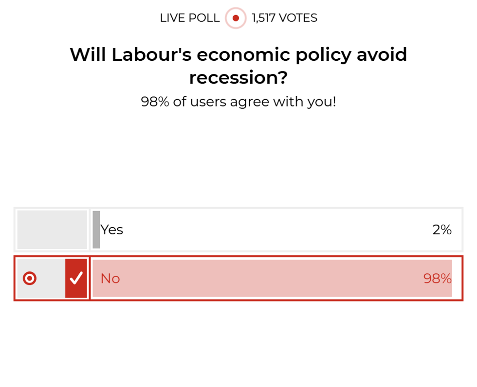 In an exclusive poll for GB News members, an overwhelming majority (98 per cent) of the 1,517 voters thought Labour's economic policy would lead to a recession, while just 2 per cent thought the party could steer Britain away from a downturn.