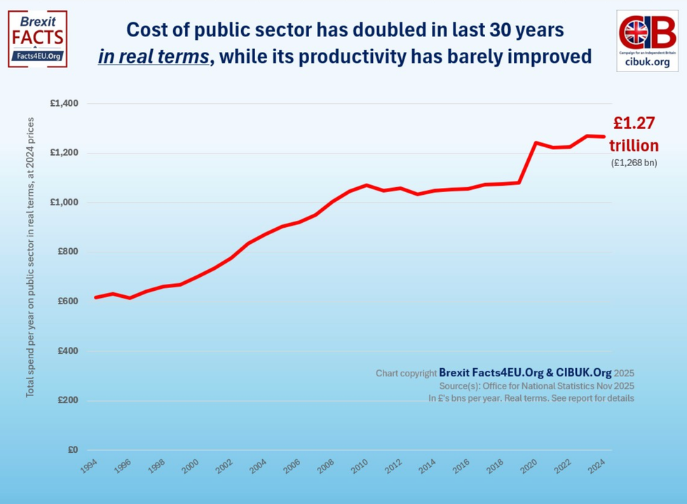 The graph above shows the cost of public sector has doubled in last 40 years in real terms, while productivity has barely improved