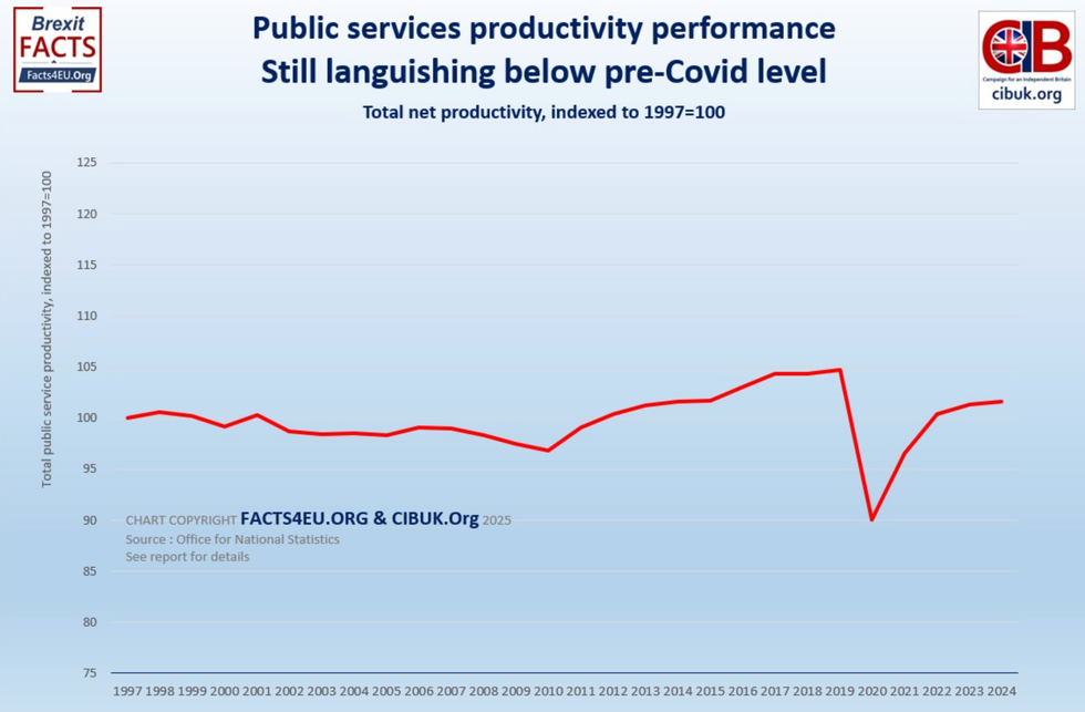The above graph shows the official figures for public service productivity from the ONS. This clearly shows a poor performance for many years, but in the years leading up to Covid this had been improving.