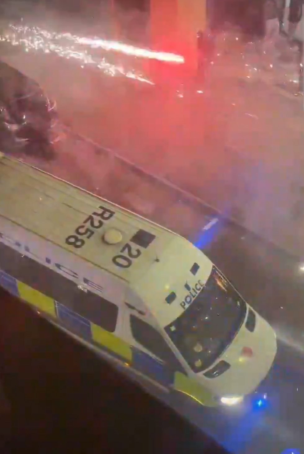 PICTURED: Firework rockets scream past police vans in central Brimingham