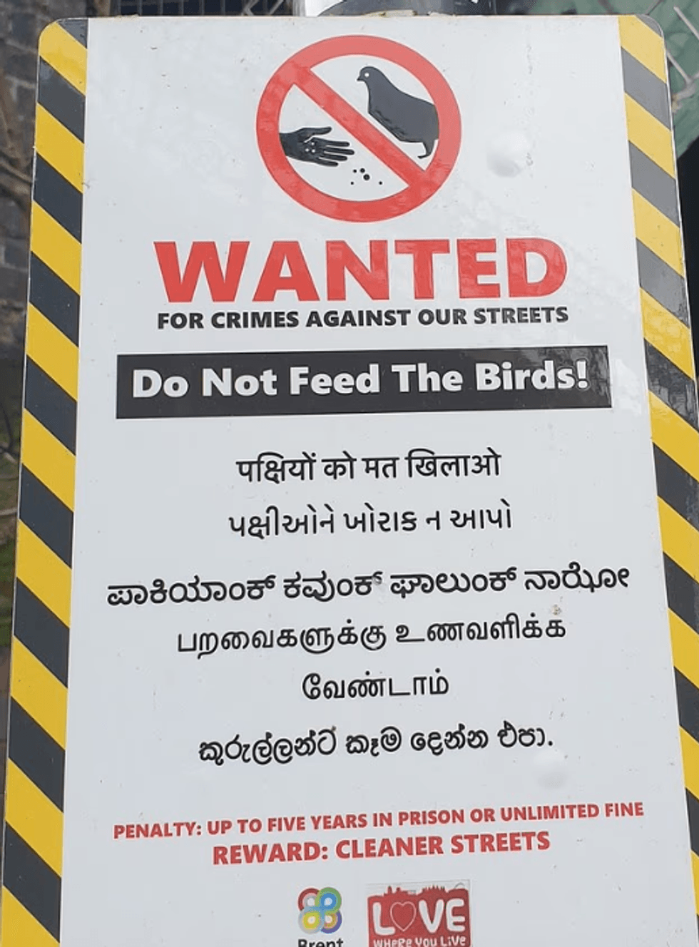 In Kilburn, north west London, notices from Brent Council threatened that residents and tourists feeding birds could face an unlimited fine or five years in prison.