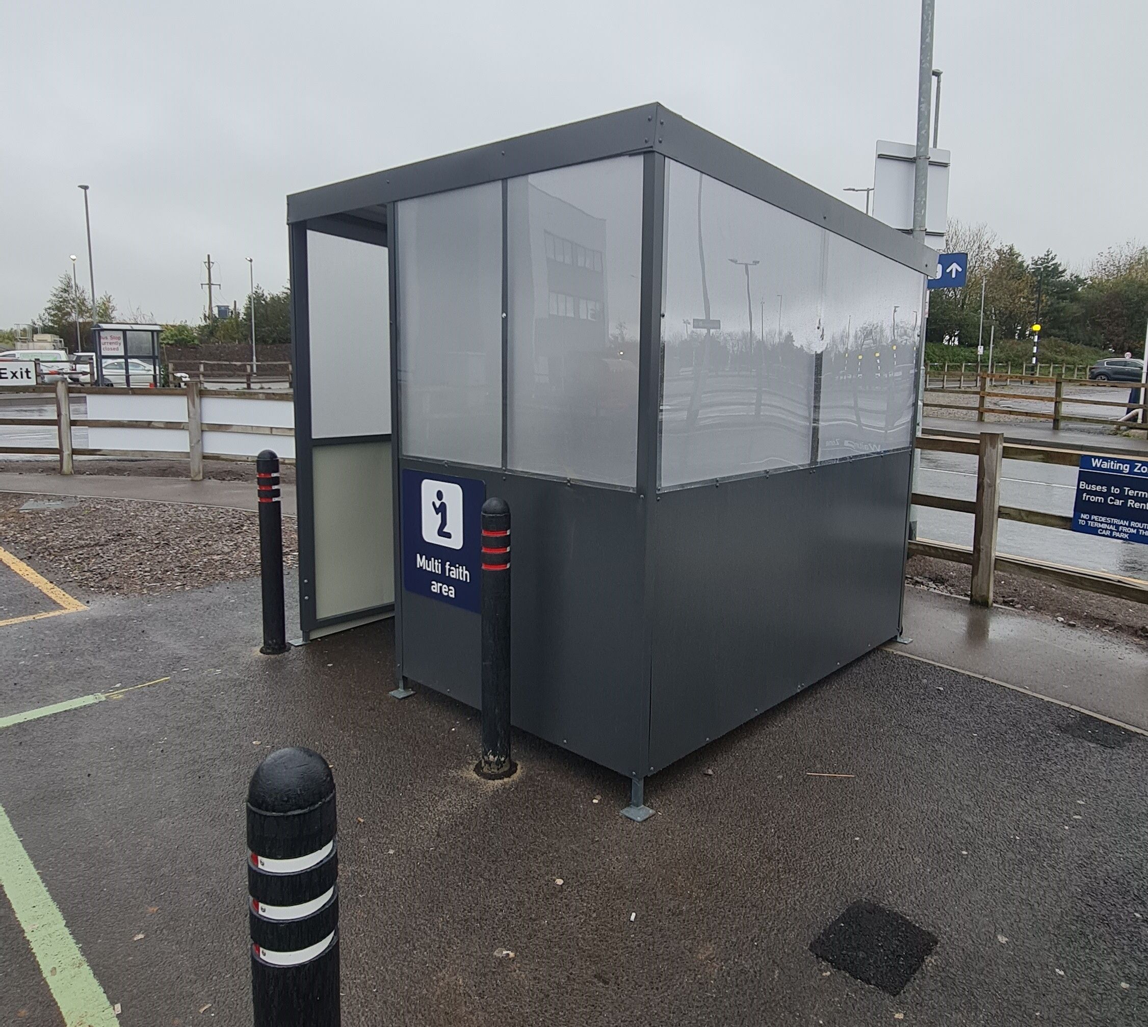A sign, showing a figure praying and text, is located on the outside of the structure and reads: 'Multi faith area'