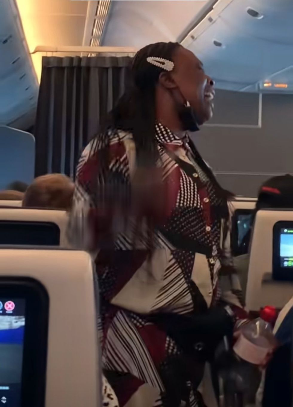 This woman was singing and standing in the aisle during the Heathrow to Jamaica flight