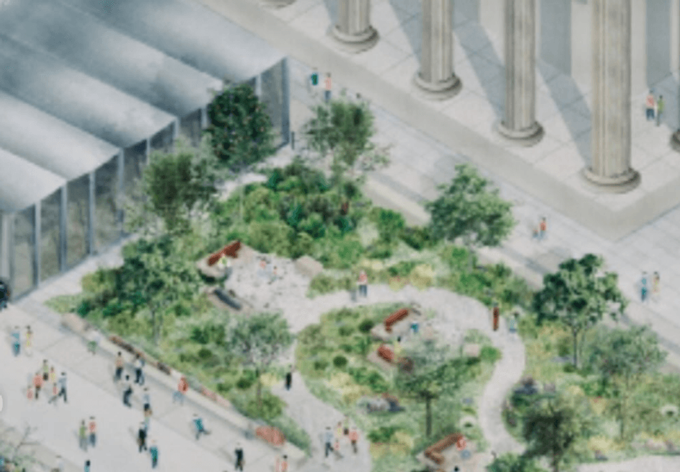 The plans also include associated queuing and wayfinding infrastructure, railings, seating, and new landscaping to both forecourts.