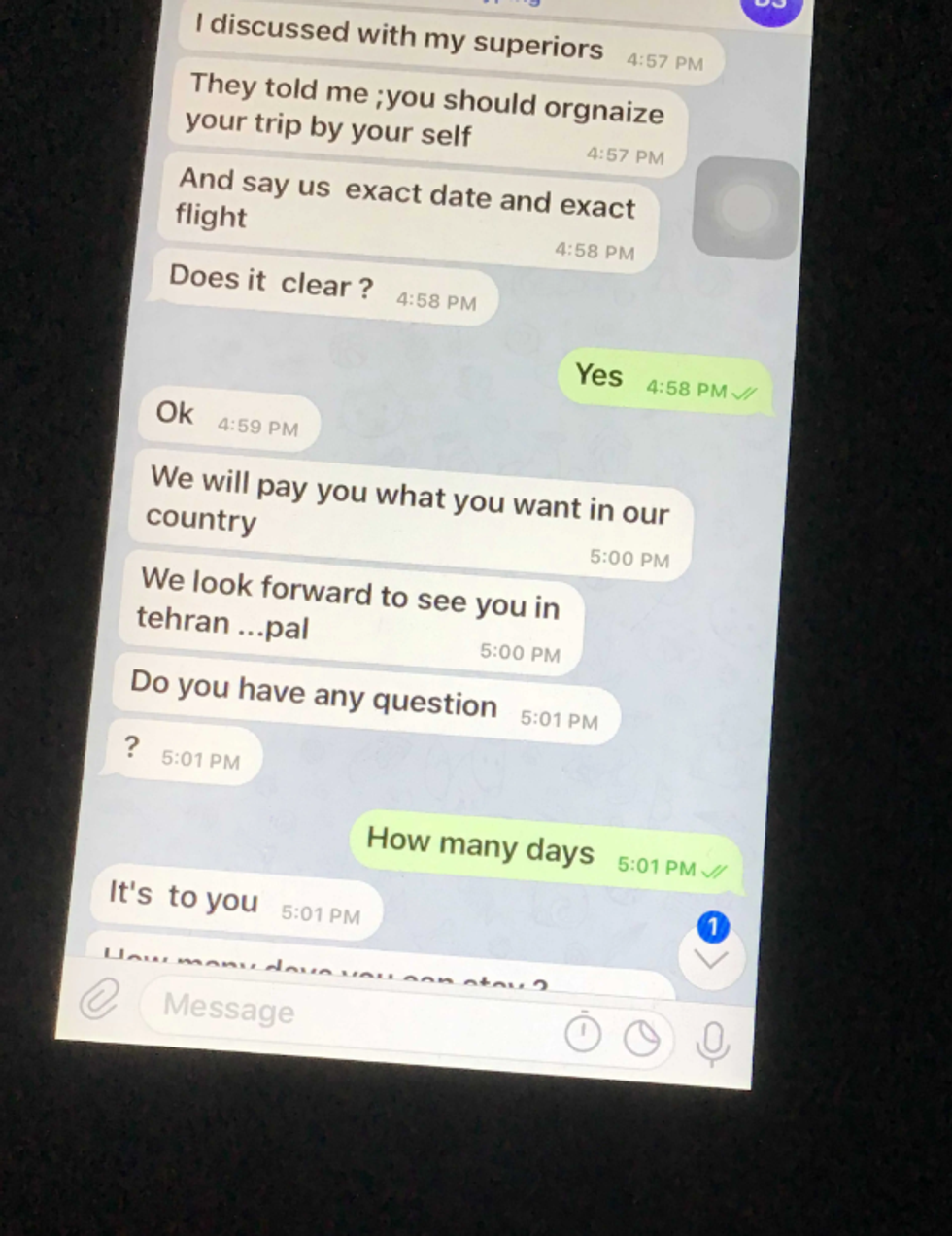 Messages on a phone screen between Daniel Khalife and 'David Smith' - his handlers in Iran