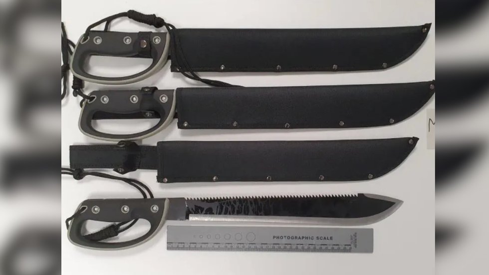 A search of the bags they were carrying found 58 machetes, combat knives and lock-knives.