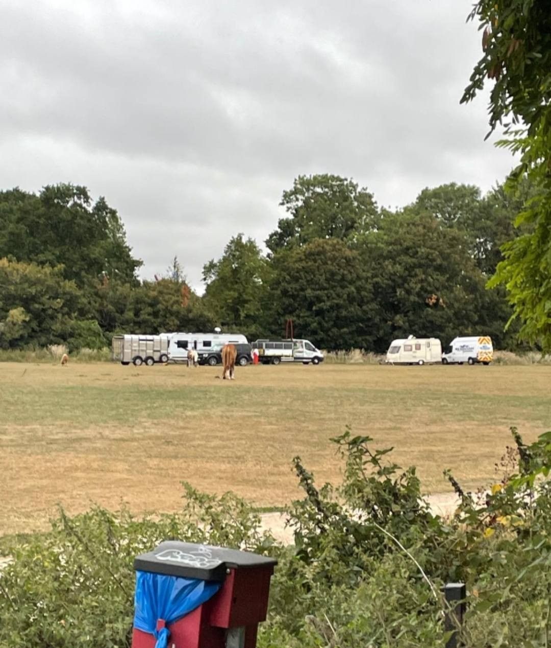 A number of cars and white caravans have been spotted at the 35-acre ancient woodland, as well as several horses.