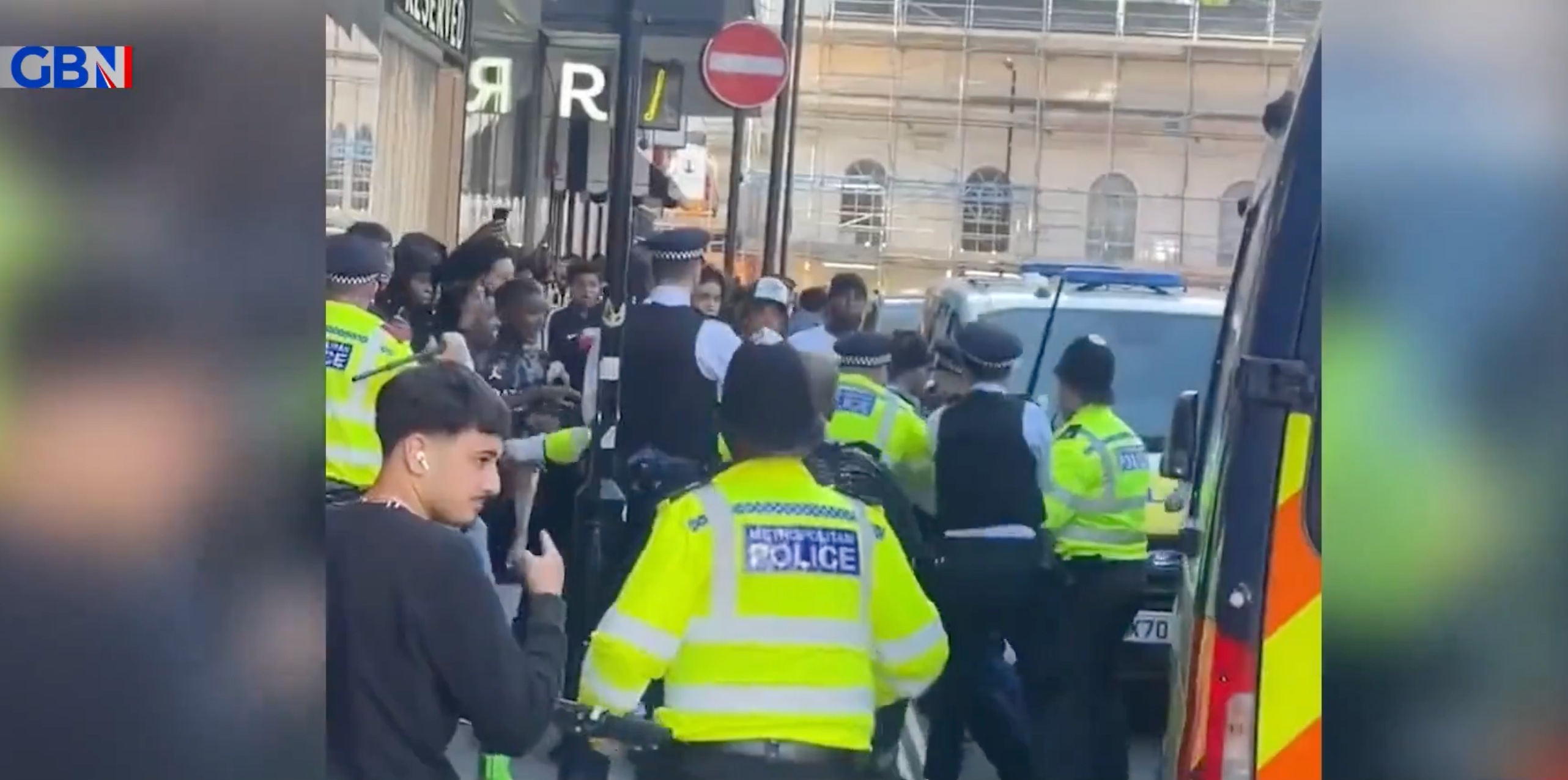 Police officers detain a man outside McDonald's on Oxford Street, central London on August 9, 2023.