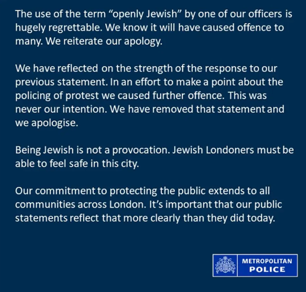The Metropolitan Police have been forced to issue a second apology for causing "further offence" after an initial apology about an officer’s use of the term “openly Jewish” sparked outrage.