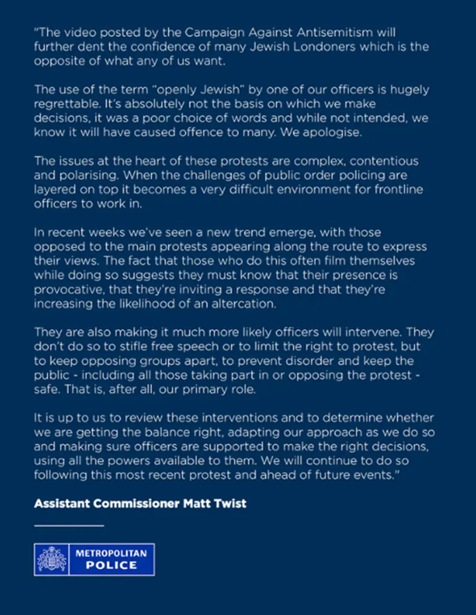 Last night the Campaign Against Antisemitism issued its response to the follow-up apology from the Met and accused the police of failing to look after the best interests of the jewish community.