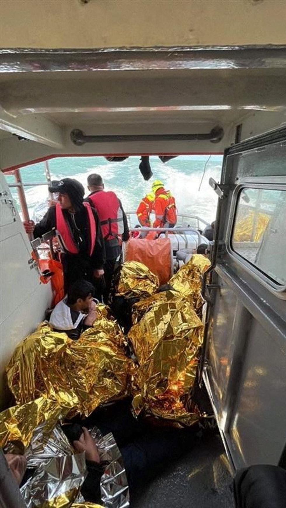 Rescued migrants sit on a French rescue ship after a migrant boat trying to cross the Channel from France capsized, in Calais, France, August 12, 2023.