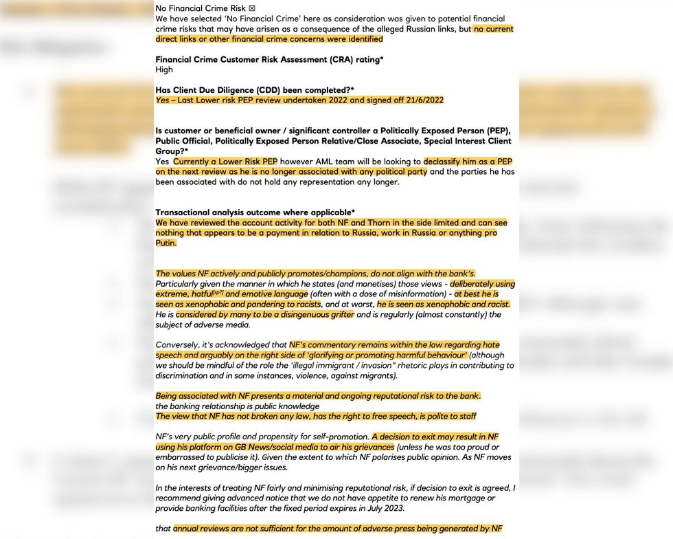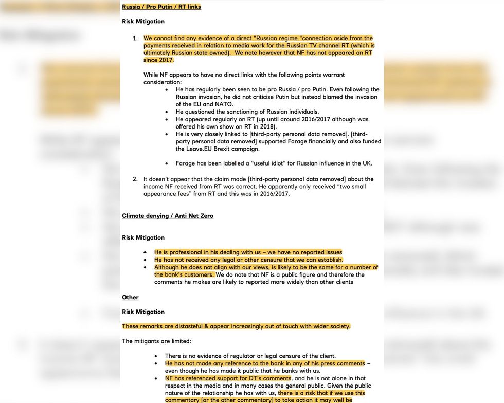 The dossier noted that there was "no evidence of regulator or legal censure" of Farage, that he was "professional, polite and respectful" to staff and that he had recently been downgraded from a "higher risk politically exposed person [PEP]" to lower risk, and was on the way to being classed as no risk at all.