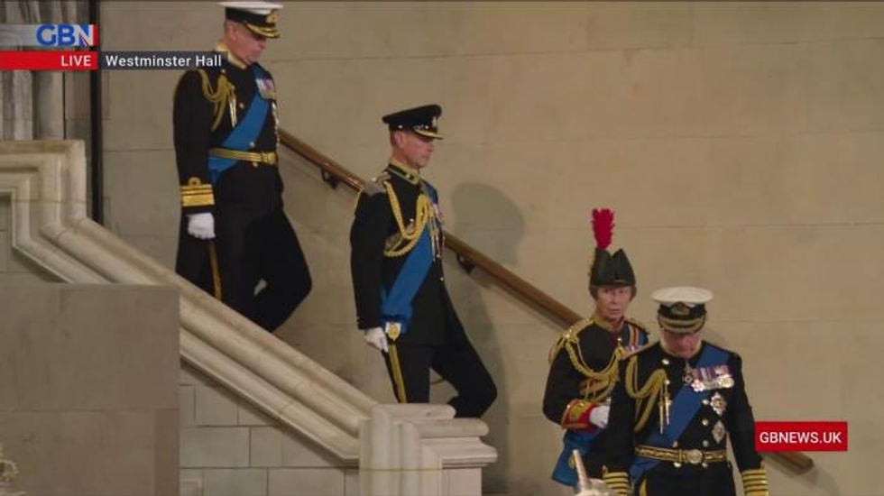 The King led his siblings into Westminster Hall, followed by the Princess Royal and Earl of Wessex, with the Duke of York just behind.