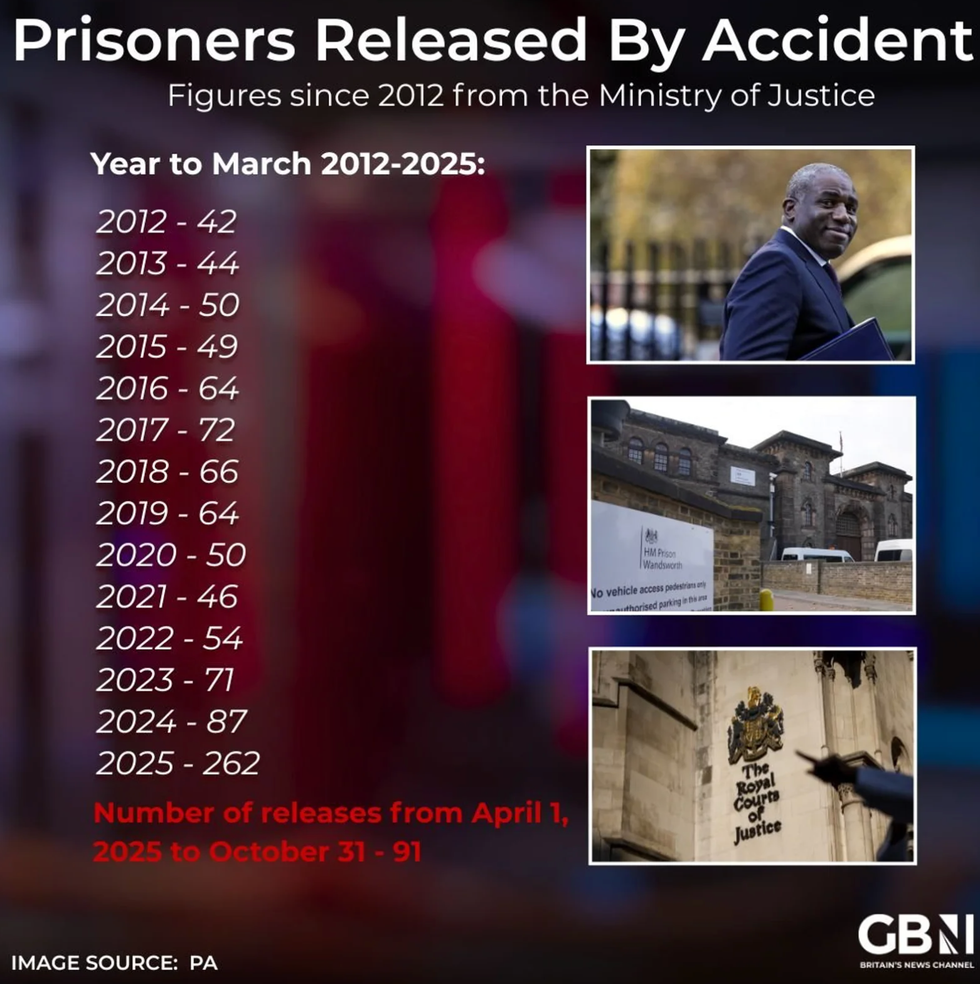 Current Justice Secretary David Lammy faces a new crisis of wrongful releases, with 262 cases in the year to March 2025, up from 87 the year prior.