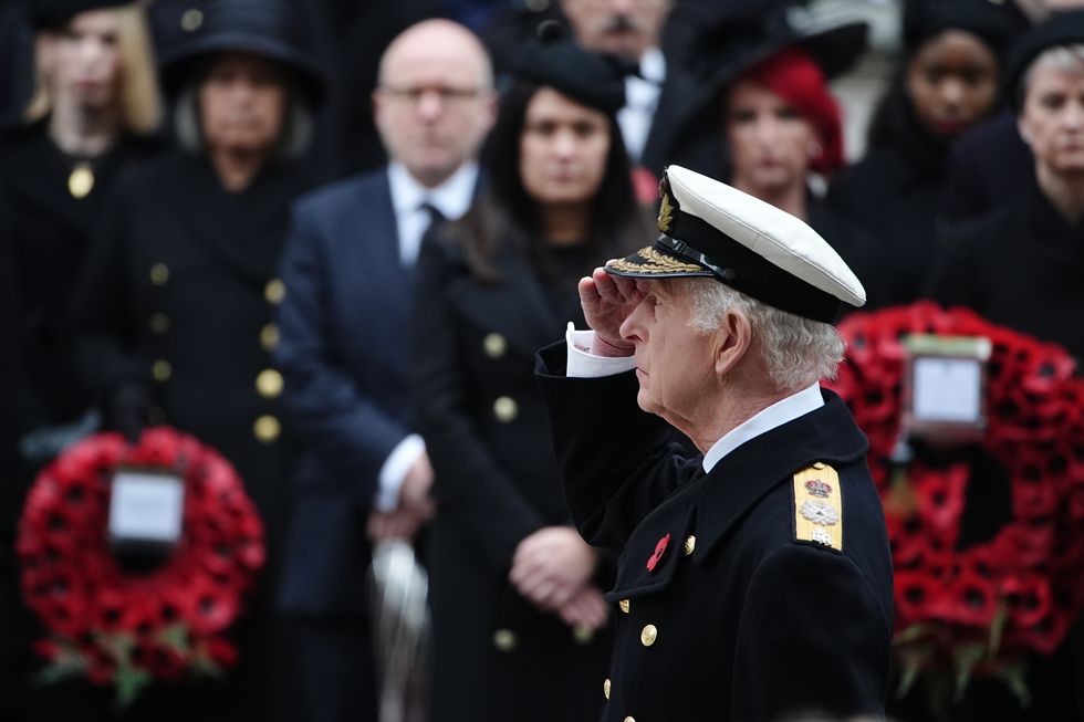 Charles wore military dress, as did the other royals, and after laying his wreath he saluted in his greatcoat worn over his uniform of an Admiral of the fleet, with a sword by his side | PA