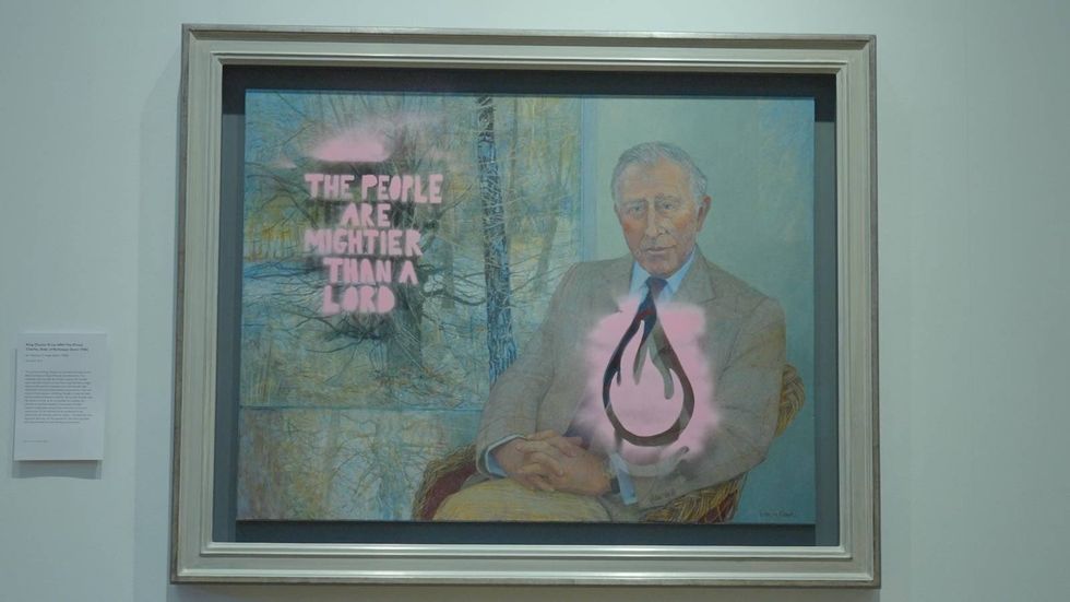 The pontificating pranksters emblazoned King Charles III with their logo, before spraying the words: “The people are mightier than a lord.”