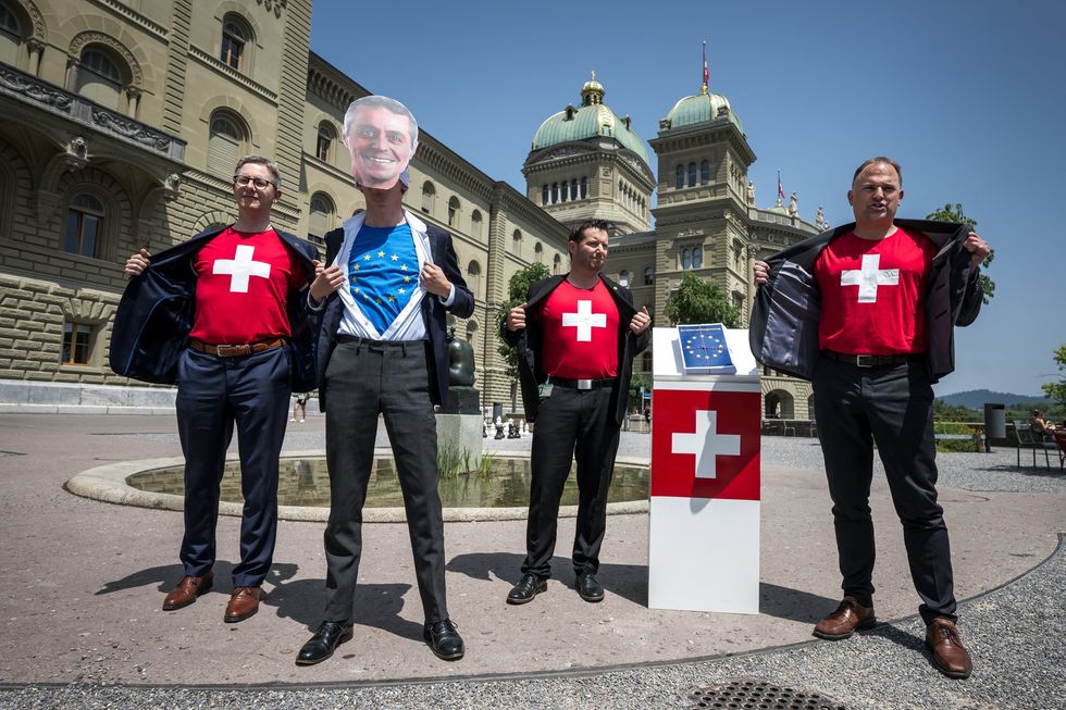 SVP Parliament members protested with a man wearing a cutout of Swiss Foreign Minister Ignazio Cassis