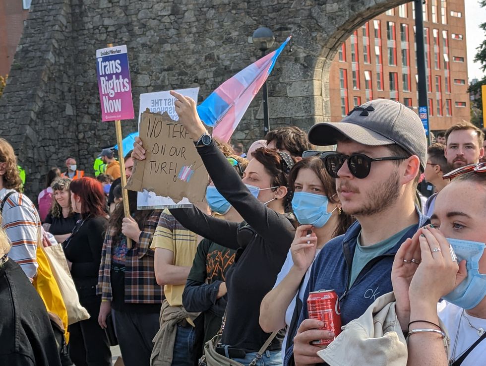 Counter-protesters at the rally carrie placards that read: "Terfs not on my turf."