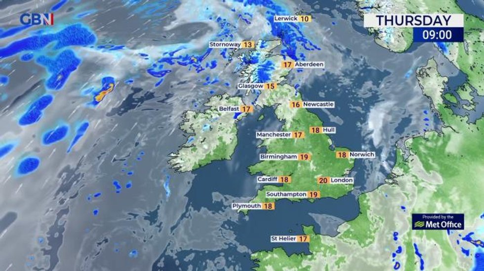 Rain across Northern Ireland and southern Scotland moving into Wales and northern England. Turning brighter to the north with a few showers. Warm sunny spells for southern and southeast England.