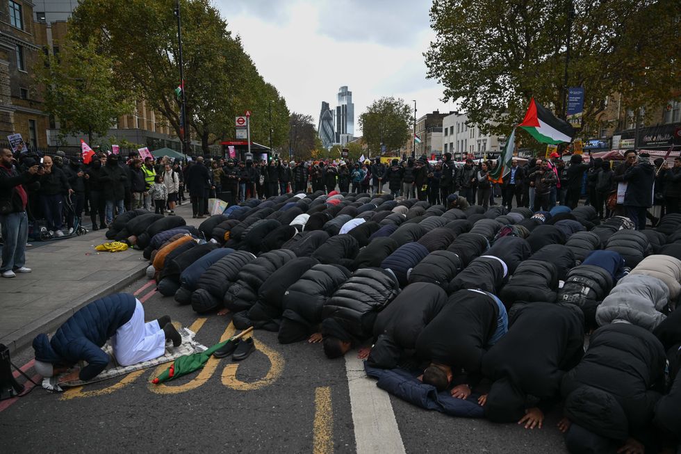 Palestinian and Bangladeshi flags were seen as demonstrators prayed in the street on Saturday