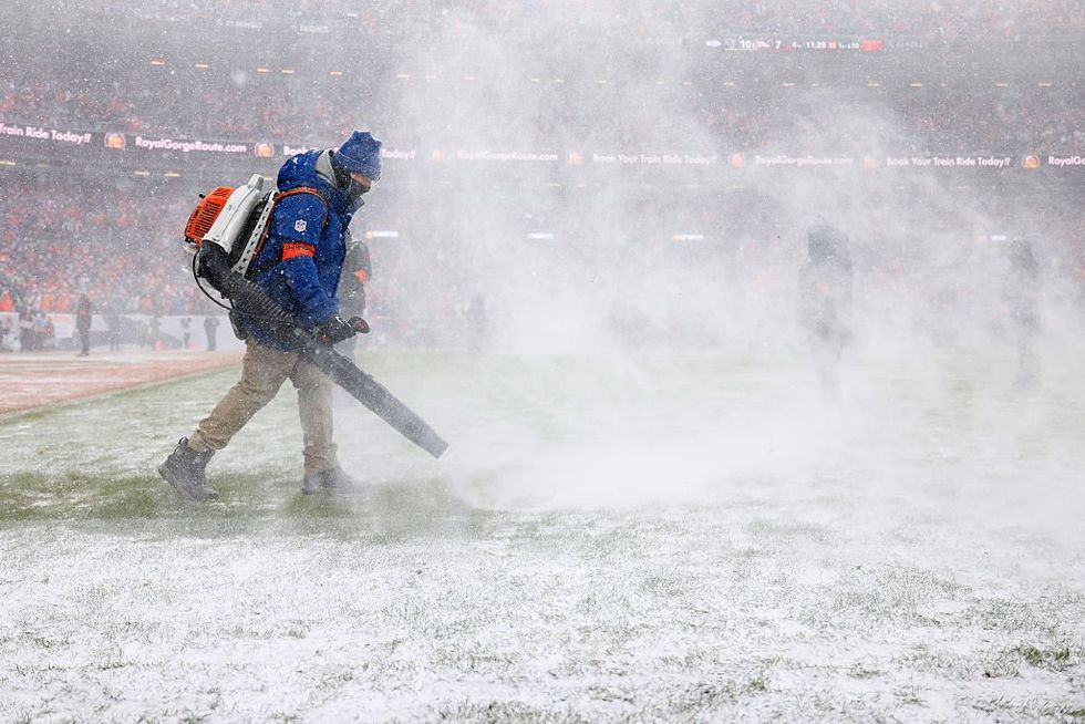 Crew members clear the field of snow during the fourth quarter in the AFC Championship Playoff game between the New England Patriots and the Denver Broncos
