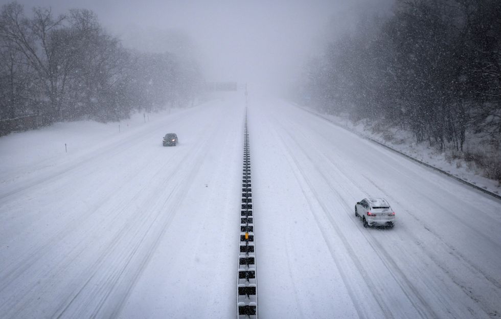 Two cars travel on the north and southbound lanes of the snow-covered New York State Thruway