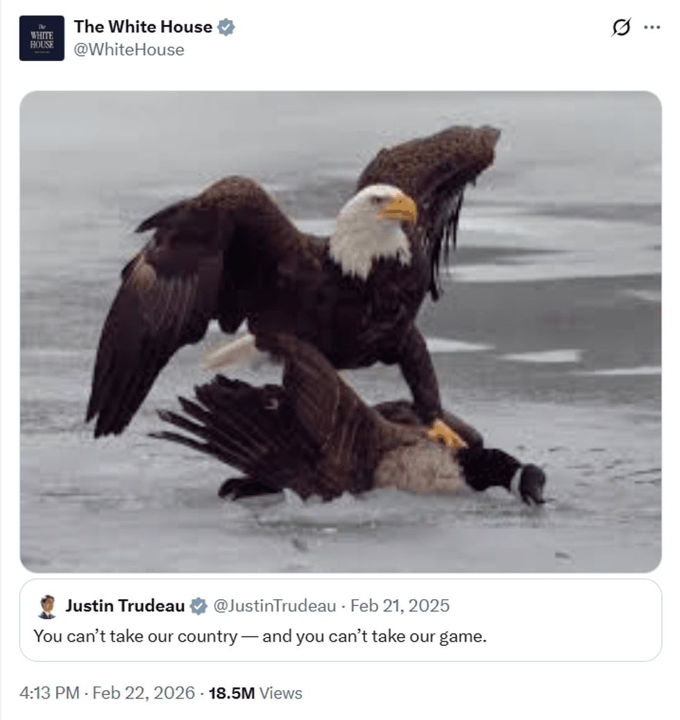 It posted an image of a bald eagle standing over a Canadian goose - a direct reference to a 2025 remark by Mr Trudeau.