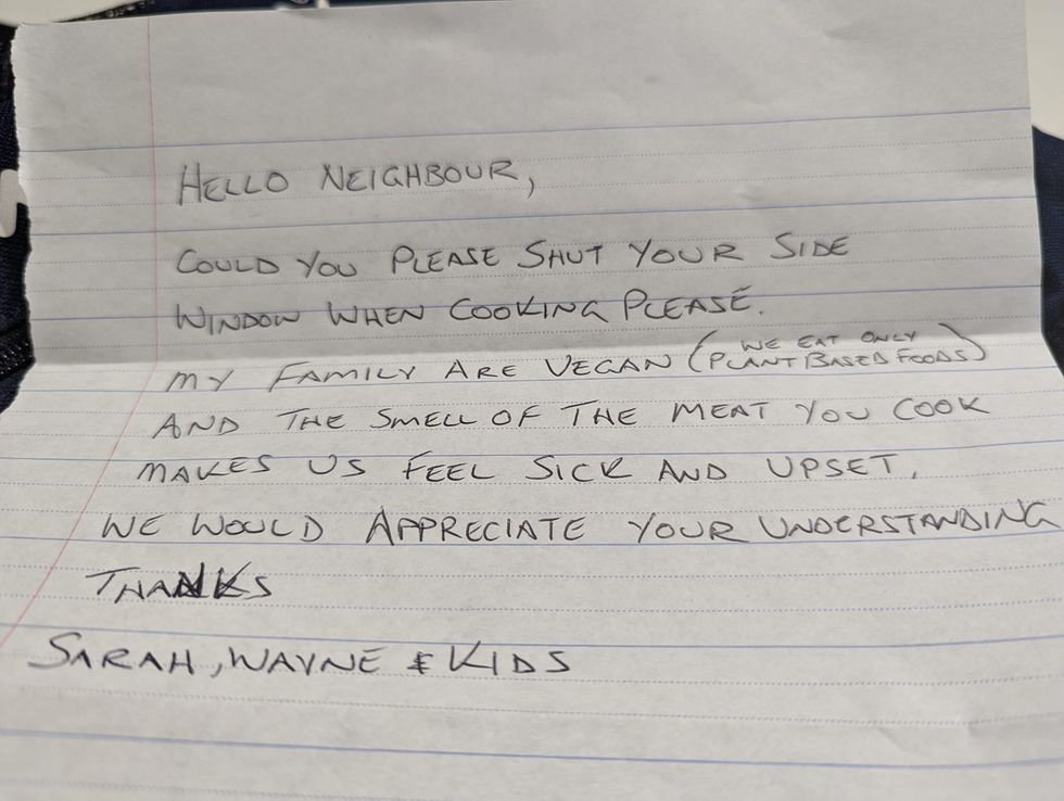 A family received a note from a furious neighbour asking them to close their window while cooking meat